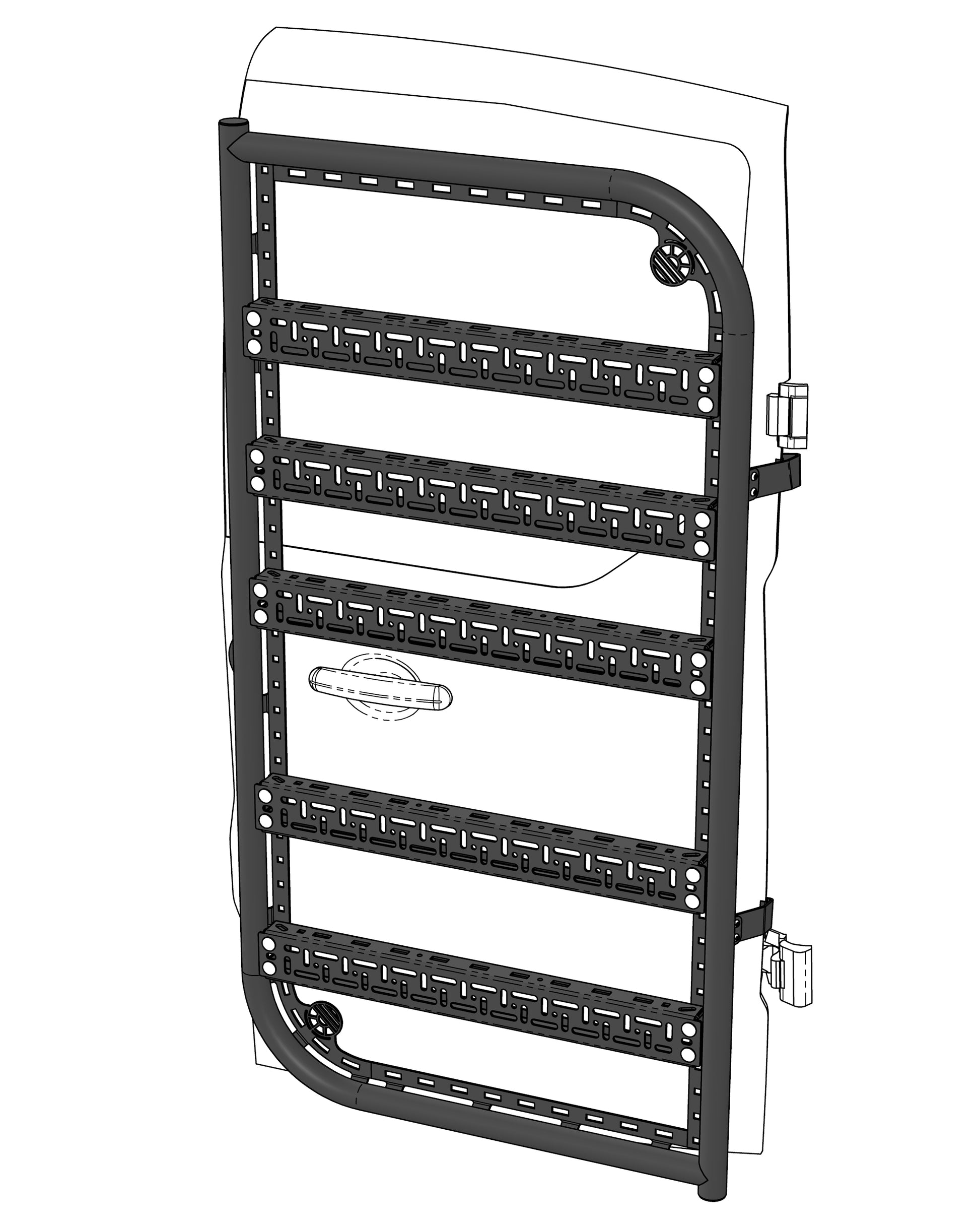 The Backrack bolts to the existing hinges on the door and through two small holes that you will need to drill in the edge of the right-hand door.