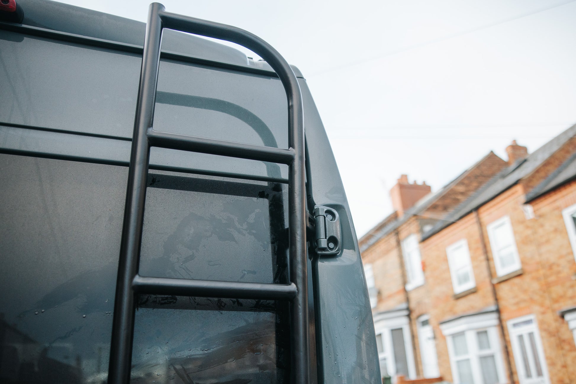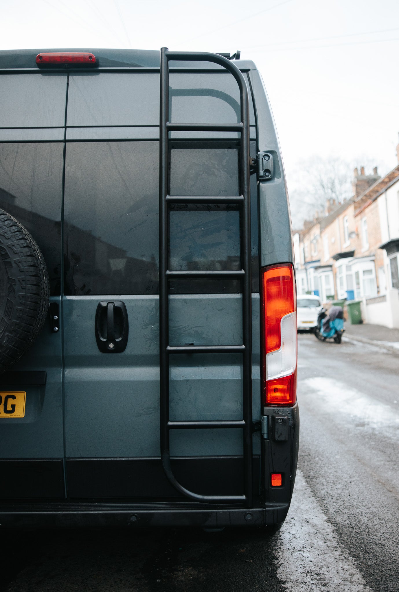 MIG welded mild steel right-hand ladder designed to fit Citroen Relay, Fiat Ducato, Peugeot Boxer 2006-present. Designed and manufactured in Yorkshire by the Wheeliams team. Our ladders are made to order, with a lead time of around 4 weeks.