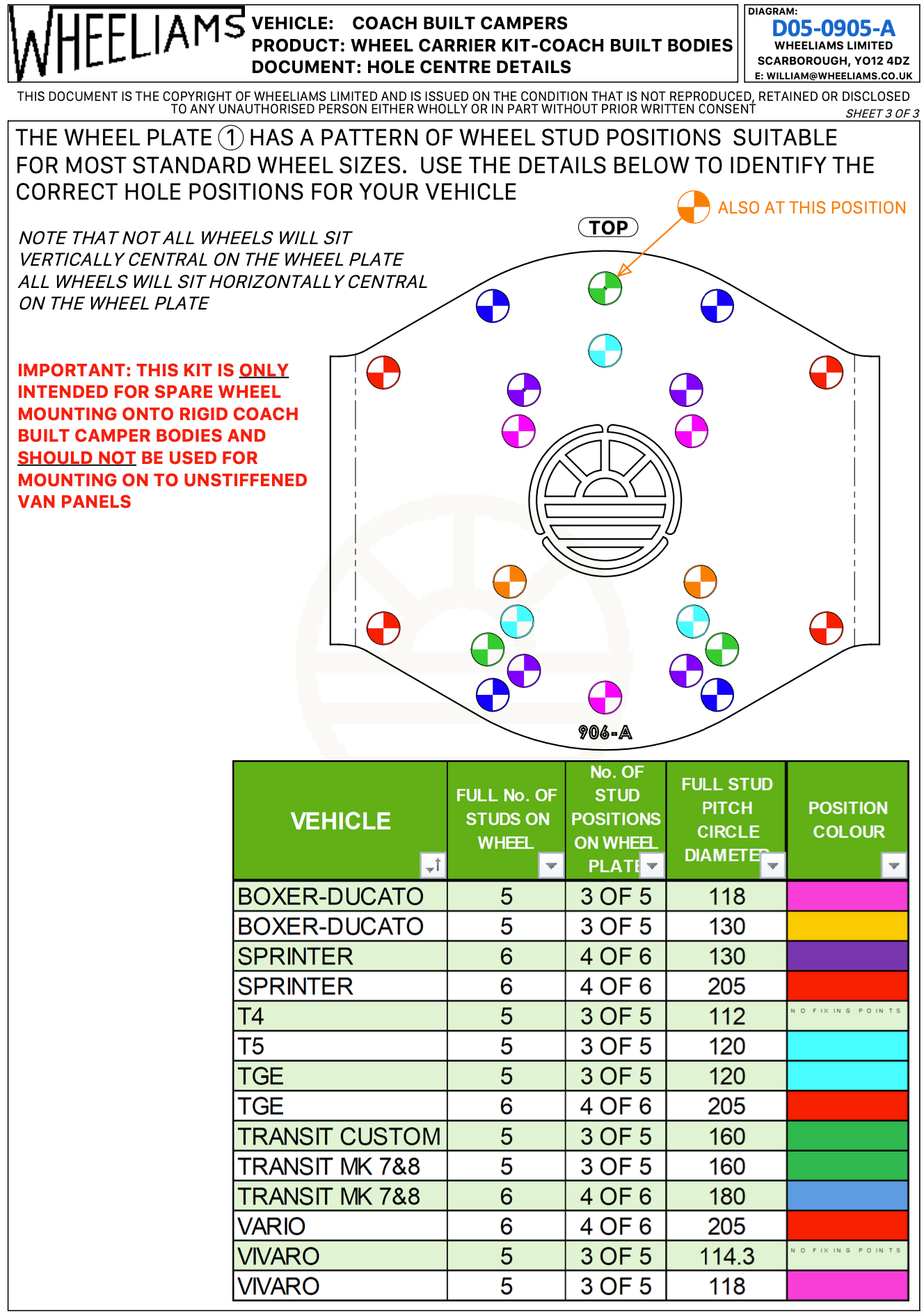 Motorhomes are built onto chassis from a variety of manufacturers. Whether you have one built on the Fiat Ducato, Peugeot Boxer, MAN TGE, Mercedes Sprinter, Volkswagen T4, T5, Ford Transit, then our wheel carrier is designed to accept your spare wheel. Please see the photo to see the PCDs supported by this carrier.