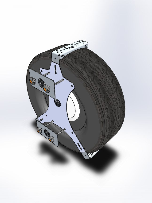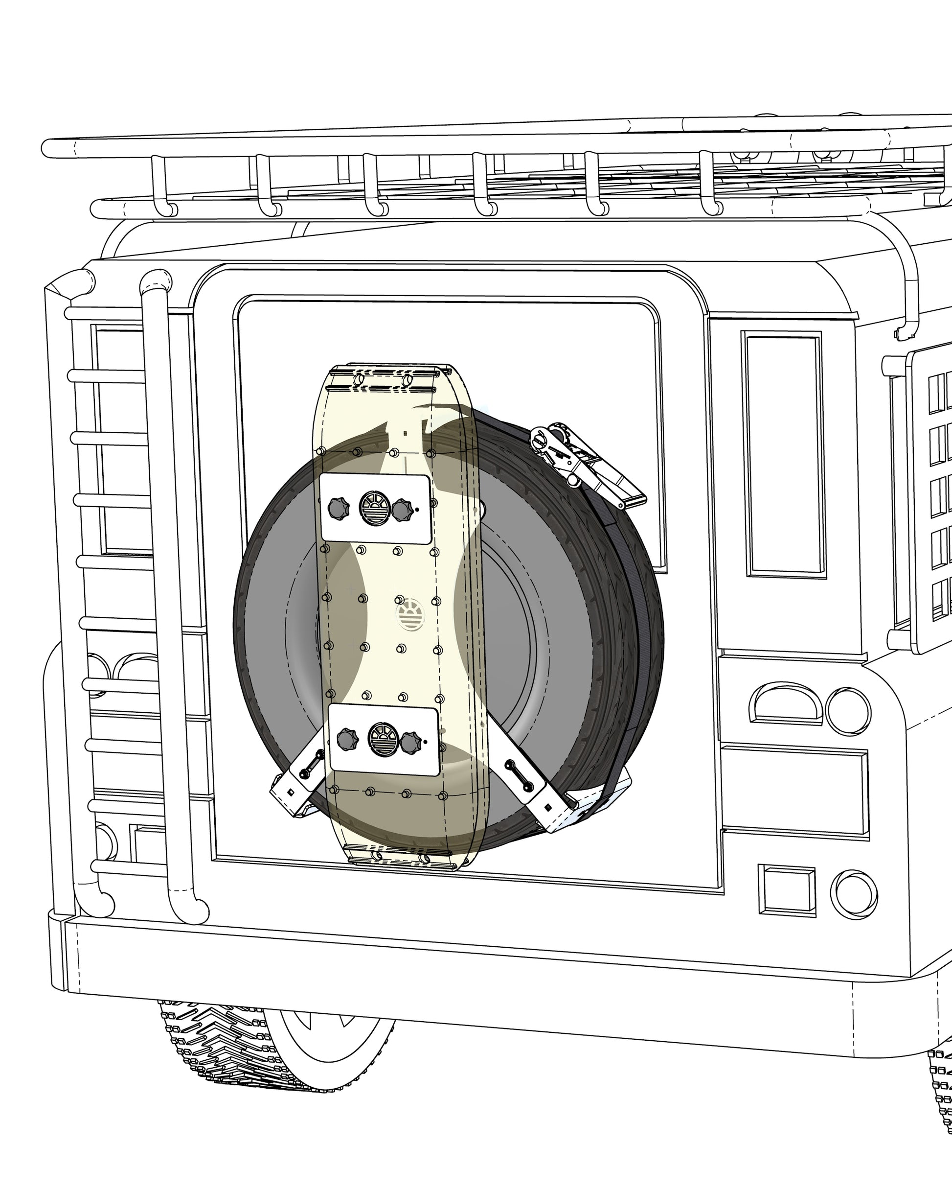 The mounting kit fits using three Strap Beams that sit on the outer diameter of the spare wheel; one positioned at the top (12 o’clock) and two others at the 5 o’clock and 7 o’clock positions. A mounting plate is bolted to the ends of these beams, and it is to this that the Recovery Tracks are clamped.