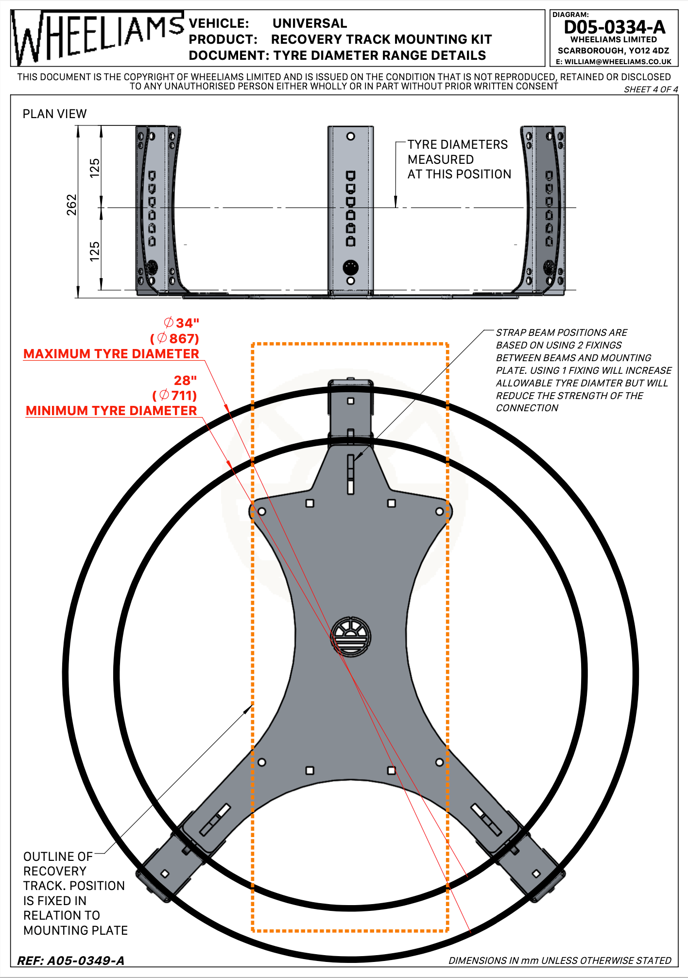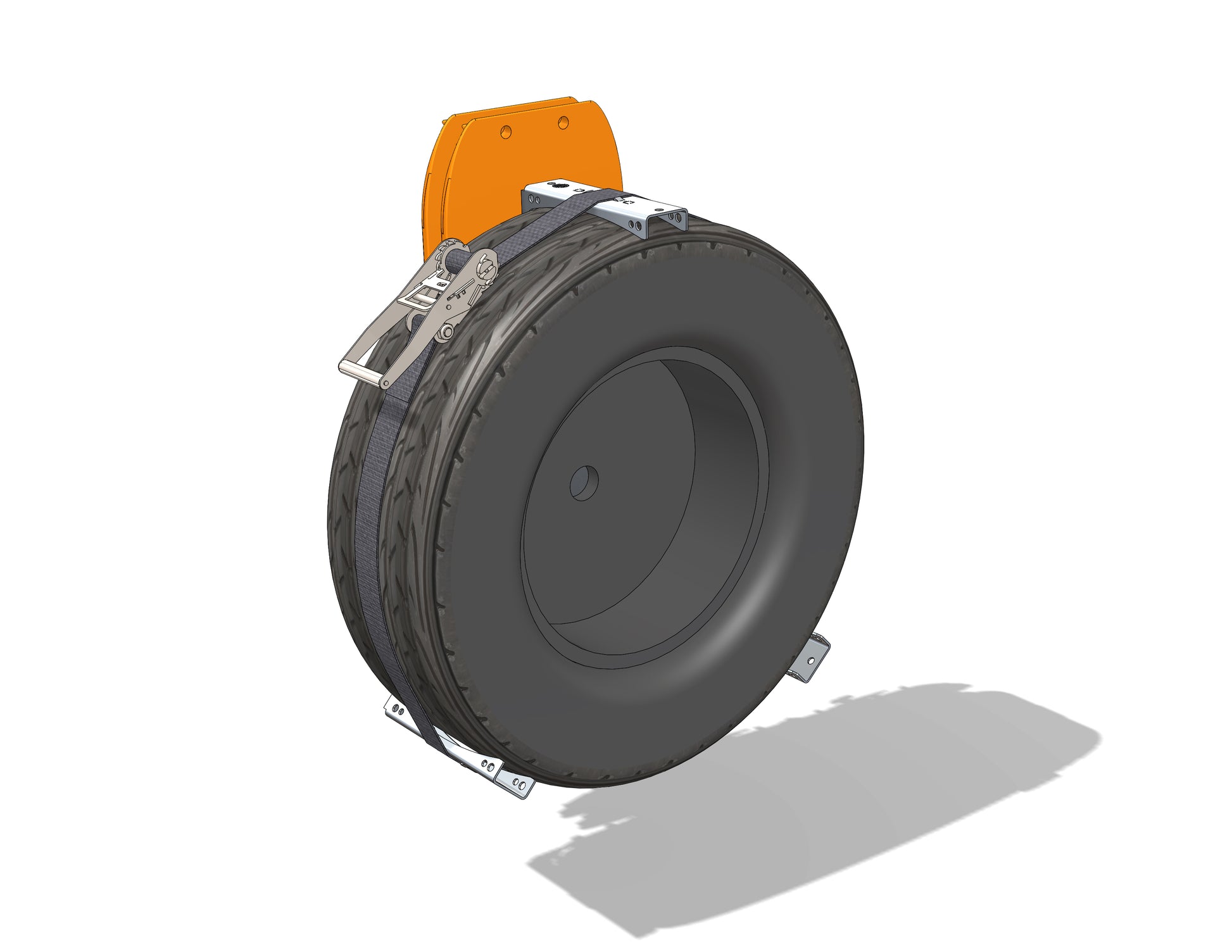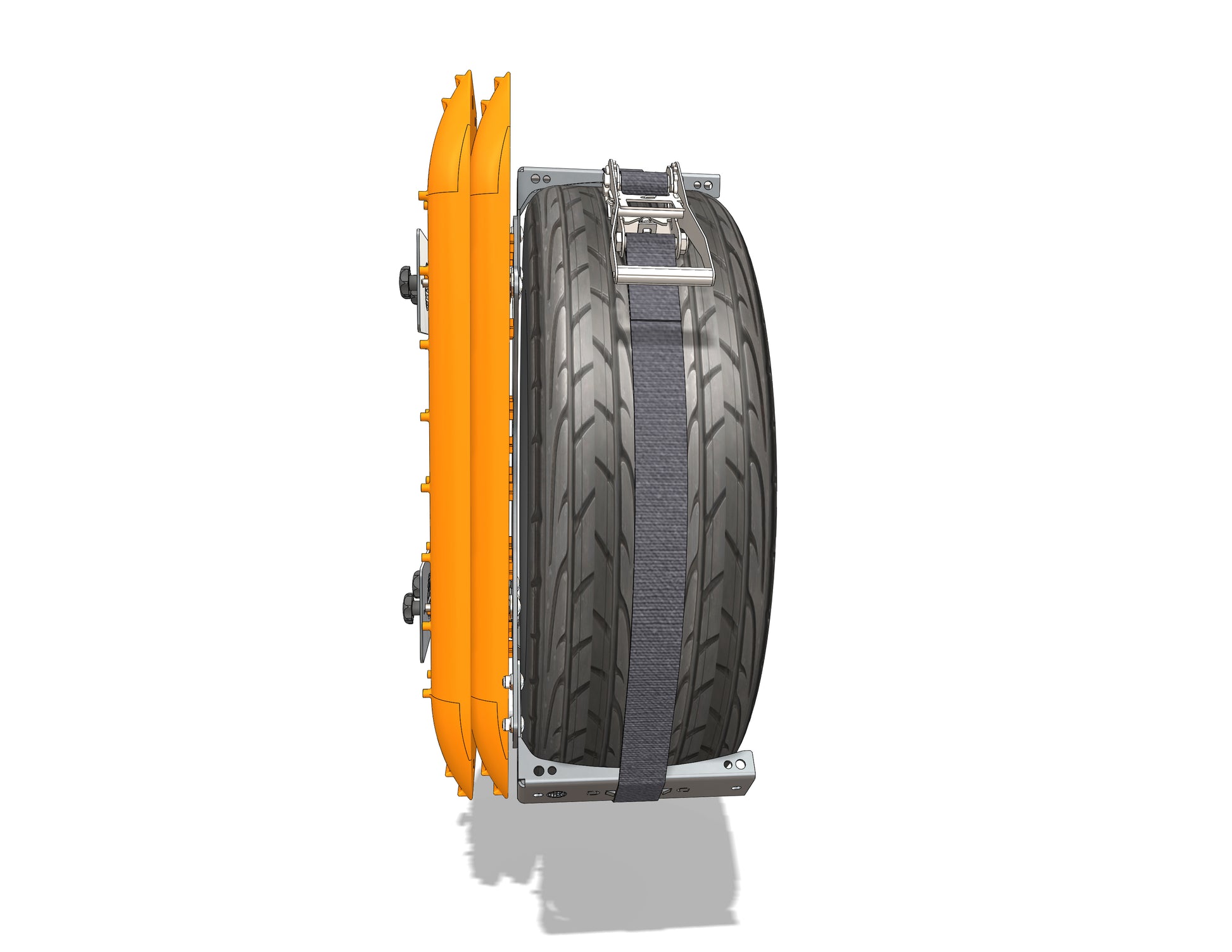 A 3m, 50mm wide ratchet strap (included) is passed around the outside diameter of the wheel, over the Strap Beams and is fully tightened to clamp the beams onto the tyre.
