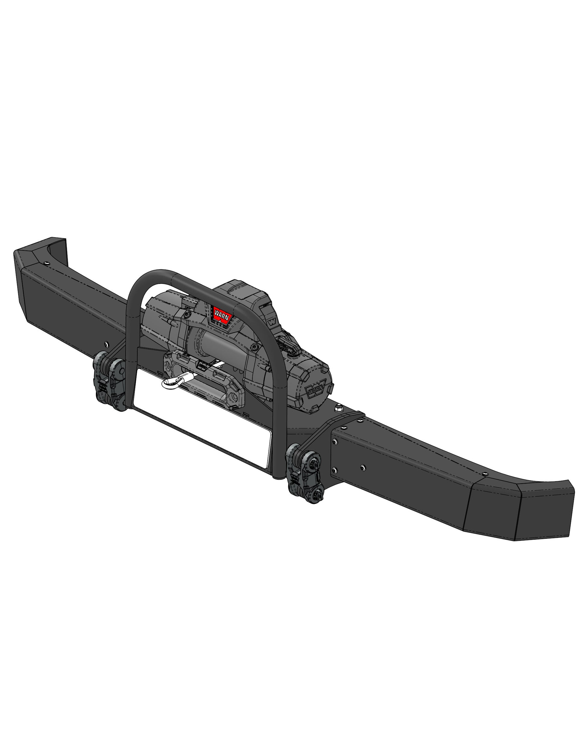 Side bumper sections are bolted to the central winch mount section and the vehicle chassis for ease of assembly and maintenance.