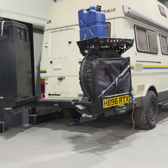 This is an incredibly versatile rear bumper replacement that allows storage boxes and spare wheels to be mounted on the rear bumper and hinges them out of the way to give full access to the rear of the vehicle.