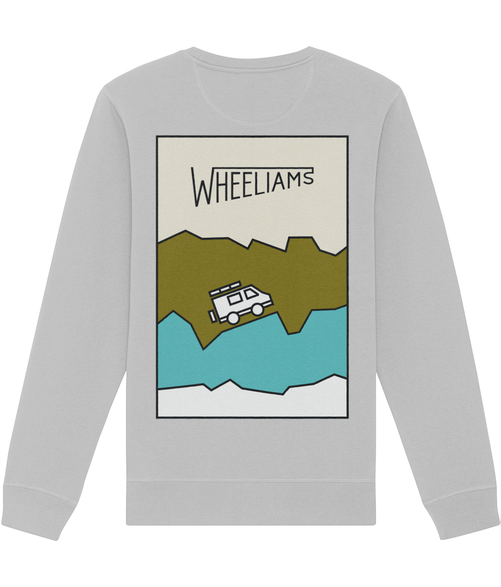 The ultimate adventure-ready sweatshirt. Featuring the Wheeliams logo in black on the front, and our original artwork on the back. Get equipped!